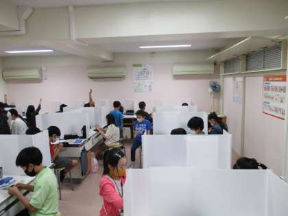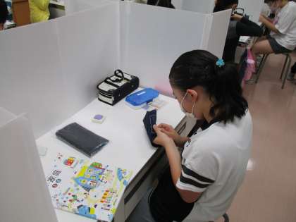 5年生が家庭科室で刺し子のコースターづくりに取り組んでいます。パーテーションで仕切りをすると、周りが見えない分、自分の作業への集中する気持ちが高まるようです。まるで誰もいないかのようにしんとしています。