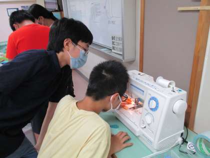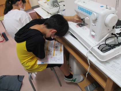 自分だけのオリジナルマスクを目指して、取り組んでいます。久しぶりのミシンなので、下糸のボビンの付け方を教科書を見ながら調べています。待ち針で留めたとおりに縫えるように、ゆっくりと確認しながら縫っています。