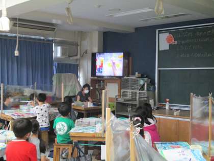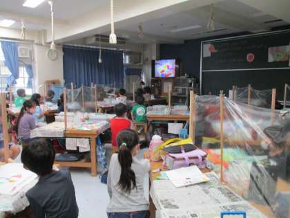 「にじんで広がる夢の世界」の学習で、どのように水を含ませた筆で「にじみ」を出すか、色の組み合わせの工夫の仕方をどのようにするかなどの説明を受けています。にじんだところから生まれる色の微妙な変化や面白さが作品に反映されていくことでしょう。