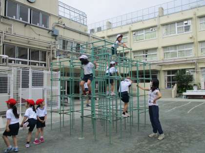 4組が校庭で体育をしています。うんていやジャングルジムなどの固定遊具を使って、腕の力でぶら下がったり、登ったり下りたり。ケンステップを「けんけんぱ」で並べたところをだんだんとリズムよく跳ぶことができるようになり、跳び方にもアレンジをするようになってきています。