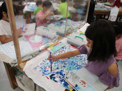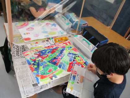 「にじんで広がる夢の世界」の作品作りです。思い思いの色を使って描いていて、にじみの効果も表現の一つとして使っています。だんだんと画用紙いっぱいに広がっていく色の世界はとてもすてきです。
