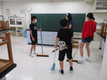 昼休みが終わると掃除の時間です。教室のごみ箱にたまったごみを捨てに行ったり、特別教室をきれいにしたりします。特別教室の掃除終了後は、窓を閉め、部屋のカギを職員室に返しに行きます。掃除用具入れの中もきれいにほうきなどの掃除用具がしまわれていて、とても気持ちがよいです。