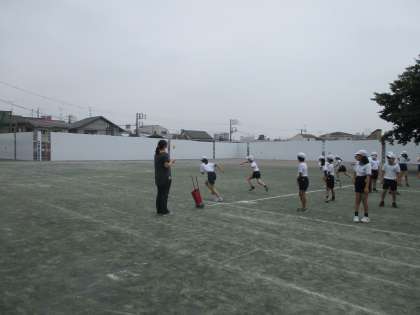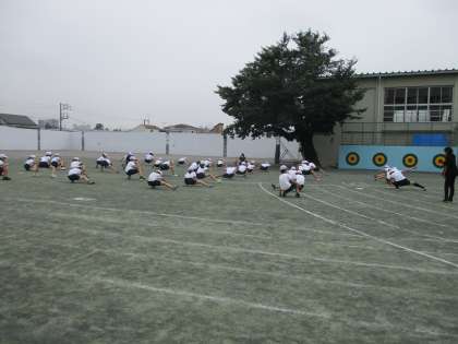 5年生がハードル走で初めてのタイムを計測するため、準備運動をしています。スタートダッシュの練習も、よいタイムを出すためには大切です。