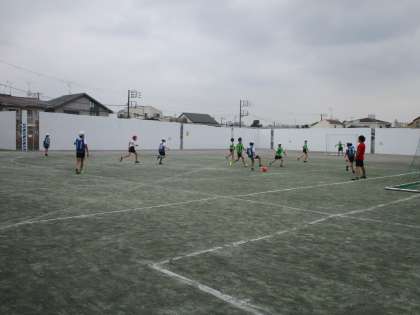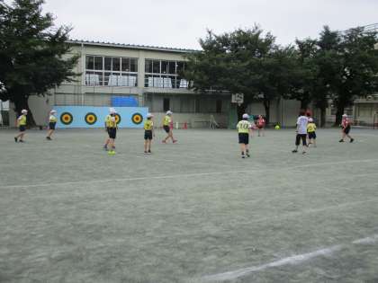 屋外球技は先週話し合った、今年度クラブでやりたい活動の中のサッカーに今日は取り組んでいます。2チームに分かれて10分間の試合をしています。