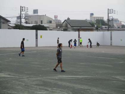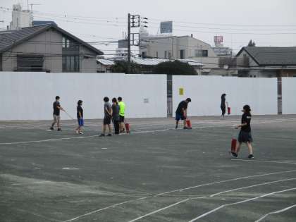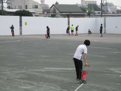 昨日雨天でできなかった高学年のために、スポーツテストのソフトボール投げのライン引きをしています。