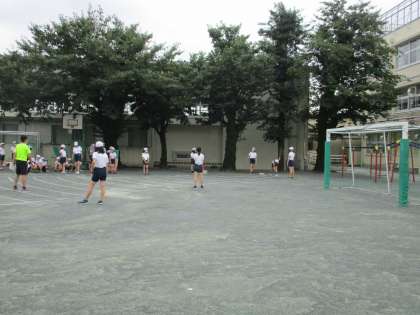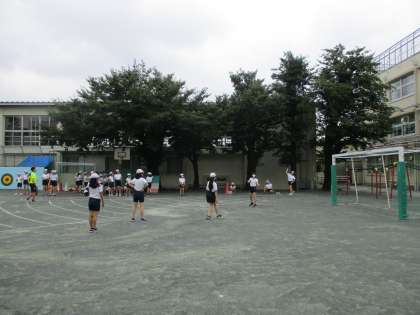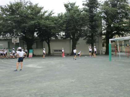 ソフトボール投げの測定が始まりました。6学年全体で女子と男子に分かれて測定しています。