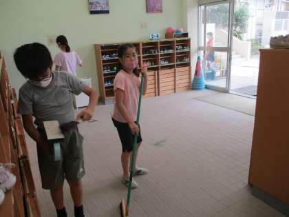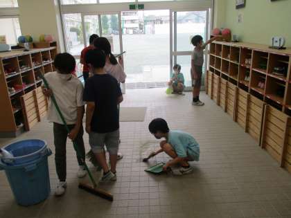 1、2年生の靴箱は、5年生が出張当番として担当し、掃除をしてくれています。靴箱の砂を掃き出したり、すのこを上げて砂を掃き集めたり、靴箱の中の靴のかかとを棚のへりに合わせて並べてたりして、すっかりきれいになりました。