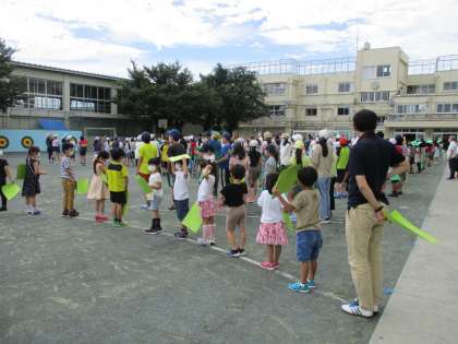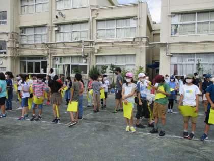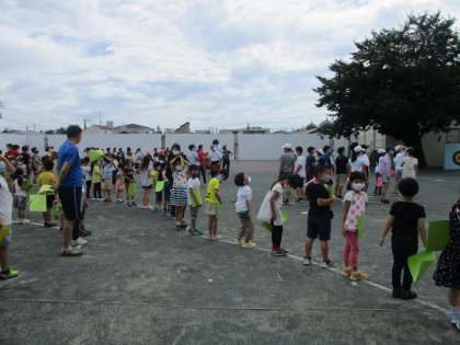 今回の撮影のための人文字は、6年生が学校再開後、考えてくれました。松原小学校らしさを出すには、コロナで3密にならないようにするには、と配慮しながら、いろいろなアイディアを出してくれて、その中から4名の人のアイディアを組み合わせて、最終的なデザインを決めました。