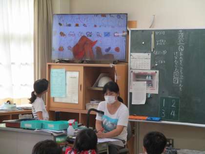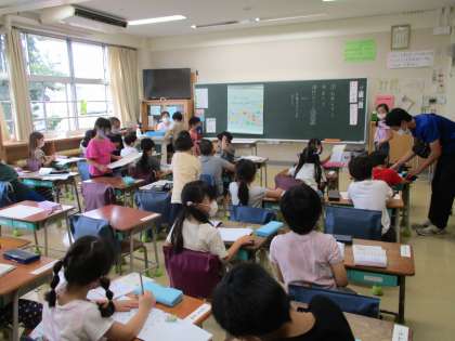 習ったひらがな一文字一文字について、ますのどの辺りから書き始めて、書き終わりがどのあたりになるか、お手本をよく見ながらワークシートに書いていきます。きちんとかけていると合格になります。合格を目指して、お手本とワークシートの自分の書いた文字をじっくり見比べています。