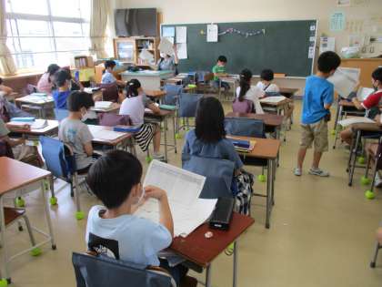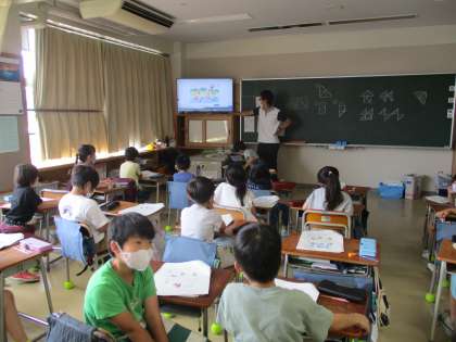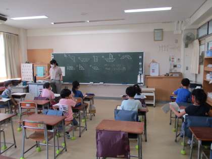 三角形、四角形を複数枚組み合わせられた形を見て、元の三角形や四角形がどのように並べられているかを考えています。画面上でも三角形を操作して、形作りに取り組んでいます。