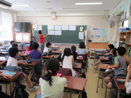 受け取った数字の書かれたカードを同じ列の友達と並べ替えて、10000にできるだけ近い数を作り、ホワイトボードにできた数字を書いています。書いた数字は声をそろえて読み、一番近かった列は優勝となります。並べ替える時のポイントとなることに気付いて、楽しく取り組んでいます。