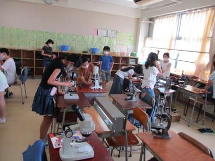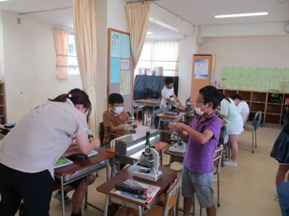 顕微鏡を使って、身近ないろいろな物を観察しようと準備しています。大きく拡大すると、いつもと違う世界を見ることができます。早く観察を始めたい気持ちが行動から感じられます。