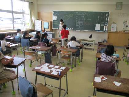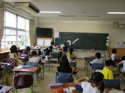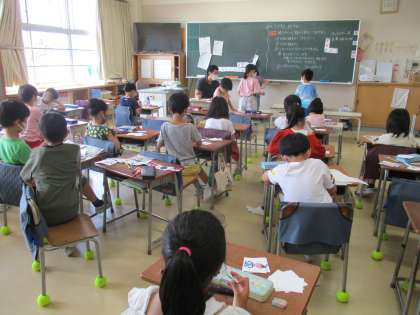 図画工作の「つづきえどんどん」では、自分の考えたお話を小さいカードに絵で表します。カラーペンで何枚も絵を描き、ストーリーに合わせてつなぎ合わせていきます。かわいらしいお話がたくさん生まれています。