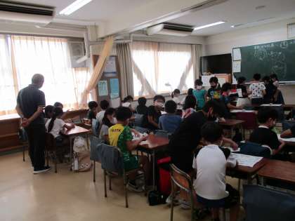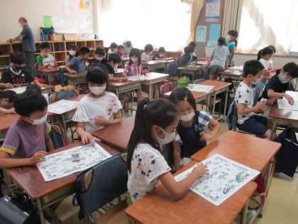 今日の算数島はすごろくです。二人組でさいころを振り、自分のこまが止まった場所の計算に取り組みます。さいころの数字もすごろくの答えを出す時に使います。