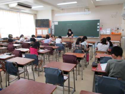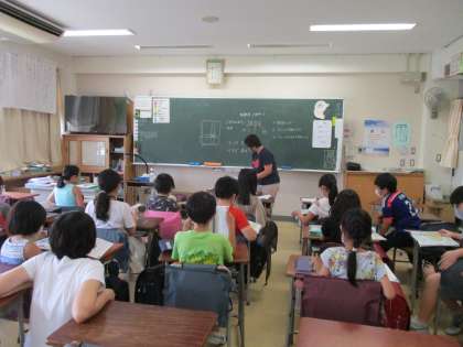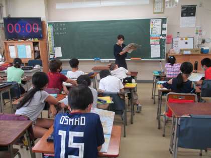 地図博士を目指して、地図帳の地図の中から、指示された情報を素早く探そうとしています。索引を使った探し方も教わり、調べてみたいことを出し合って、実際に索引で引いて調べています。