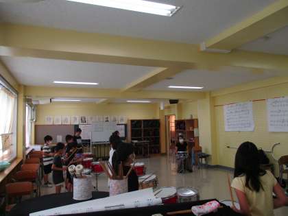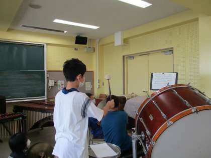 いろいろな太鼓を使って、異なるリズムを組み合わせて演奏します。楽譜には「初級」と書かれていても、実際にリズム打ちをしてみると難しいところがあり、自主練習をしています。