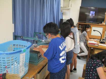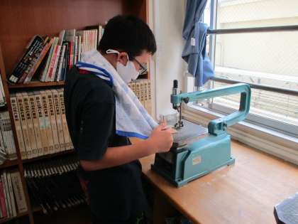 図画工作の「糸のこドライブ」では、ベニヤ板にくり抜く場所がある模様を描き、実際に電動糸のこぎりで切っています。糸のこぎりの歯を入れるための穴をきりであけている子もいます。