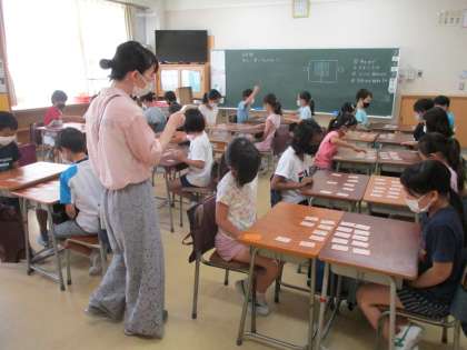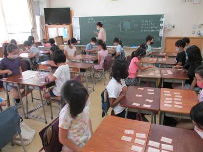 日本語の学習で、百人一首に二人組で挑戦しています。下の句の書かれた札を一生懸命に見て、先生が読み上げた札かを確かめています。