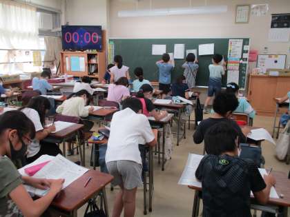 算数の「折れ線グラフ」の学習の復習プリントに取り組んでいます。全問正解できることを目指して問題を解き、答え合わせをしています。