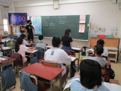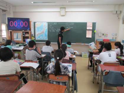日本の国土の広がりを復習しています。資料集から読み取れる分かったことを出し合い、そこから考えたことを発表しています。日本の領海が近年広がっている記述について、そのわけを考える際は、次々と自分の考えを発表する姿が見られました。