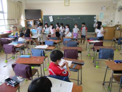 国語の学習の復習プリントにも取り組みました。プリントが終わり、先生に採点してもらっています。