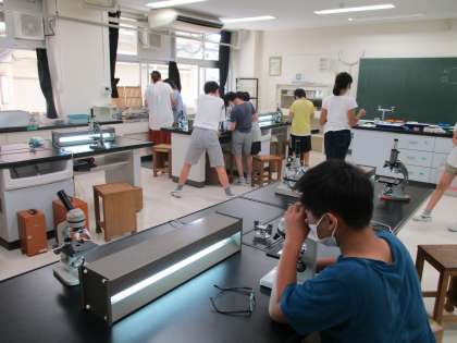 理科では、身近なものを顕微鏡を使って観察しています。ピントを合わせるのが難しく、思うように観察できるようになるにまでには、もう少し経験を積む必要があるようです。