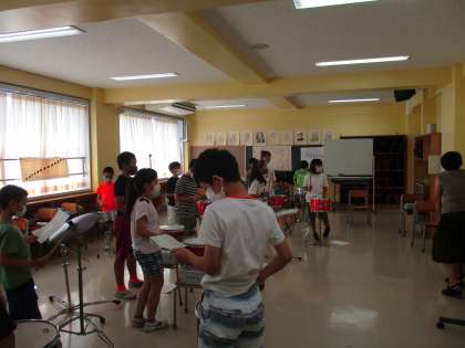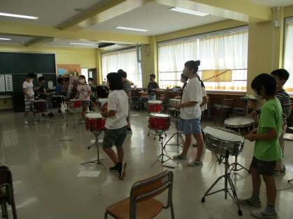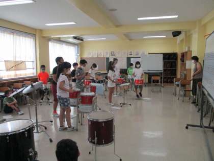 音楽では、打楽器でマーチングに挑戦しています。小太鼓と中太鼓だけで練習した後は、全員で合わせたり、メロディーを流してそれに合わせたりしました。太鼓の音がだんだんと大きくなっていくので、自分の心の中でもメロディーを歌いながら演奏する必要があります。タタタやタッタとリズムが変わるところ、休符が入るところが次々と出てきて、「できた」と満足のいく演奏ができるまでにはもう少し時間がかかるようです。