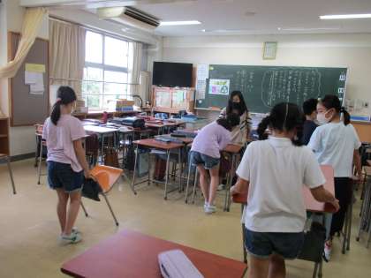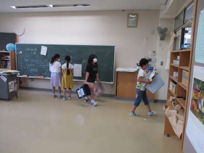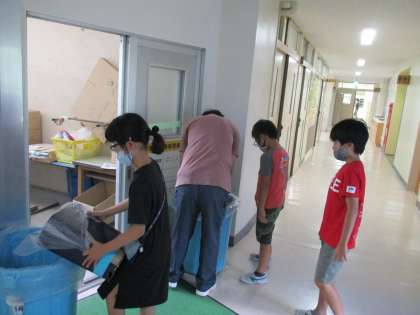 高学年の教室掃除は手際がよいです。ごみ箱がいっぱいになると、バックヤードの回収場所まで運びます。