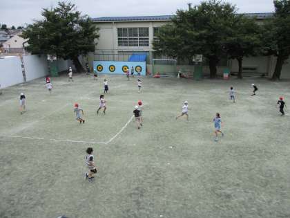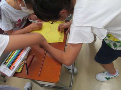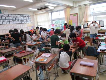 4年生は、久しぶりに集まったクラスの友達と校庭で体を動かしたり、決まった係の掲示用カードを作ったりしています。