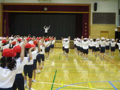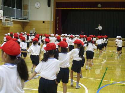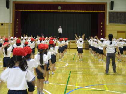体育館で運動会に踊るダンスの練習をしています。三代目J SOUL BROTHERS from EXILE TRIBEの楽曲「Rat-tat-tat」に合わせて、「ラタタダンス」を踊っています。ビートの効いた速いテンポに合わせた素早い手の動きを、先生の見本を見ながら真似しています。