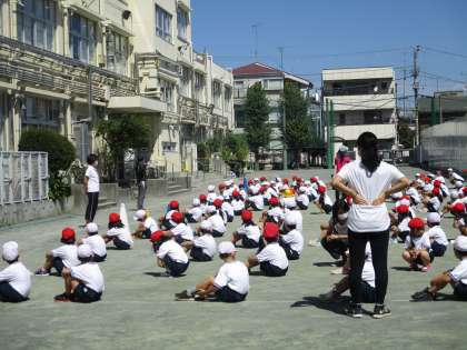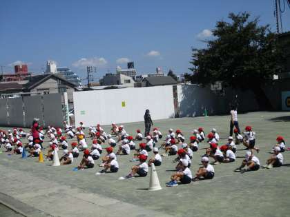 初めての校庭での運動会の練習です。暑い中ですが、ダンスをする前の先生の話をしっかりと聞いています。水分補給の時間を取りながら行っています。