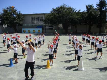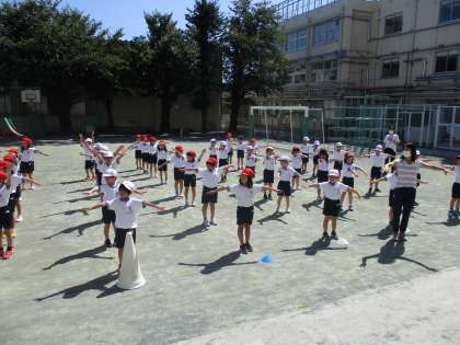 1年生の表現「Matsubara Rat-tat-tat」の練習が始まりました。先生の振りを見ながら手を上にあげたり、手首を曲げたり。手だけでなく、足も一緒に動かします。