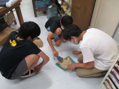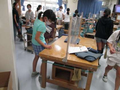 「1枚の板から」の学習の片付けの様子です。木を切ったり、切った箇所を滑らかになるよう削ったりするので、おがくずが床や机に残ります。ほうきで掃いたり、雑巾で拭いたりしています。きれいに片付けて掃除をして、次のクラスに気持ちよく教室を引き継ぐことも大切な学習です。