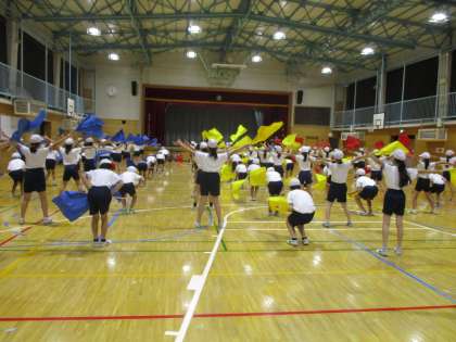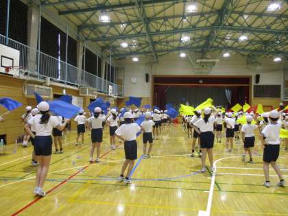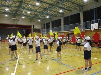 運動会の表現の練習をしています。旗を使った表現では、音楽のカウントに合わせることが大切です。一人ひとりが音楽をよく聞いて、カウントを数えながら動いています。