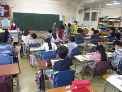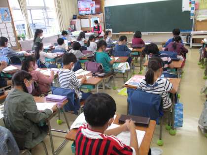 「うみのかくれんぼ」を読み、感想を書いています。書き終わった子どもたちは、ノートを提出します。この日の感想を基にし、学習課題に取り組むことを通して、文章内容への読み取りへと学習を進めていきます。