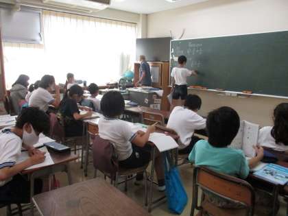分数の計算問題の復習をしています。複数の解き方のある問題について、どのように解いたかを黒板で説明していきます。