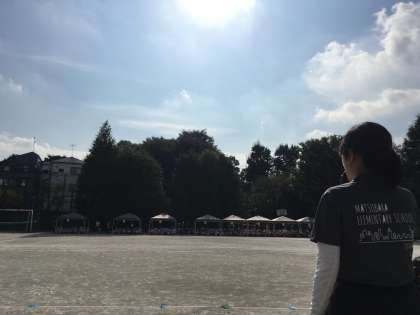 天候に恵まれ、晴ればれとした秋空の下、梅丘中学校の校庭をお借りして開催する松原小学校の運動会の開会式が始まりました。
