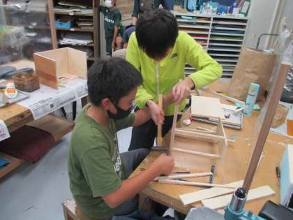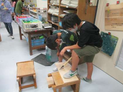 「一枚の板から」の学習で、板をのこぎりで切ったり、きりで穴を開けたり、釘を打ったりしています。のこぎりの角度をうまく調節しないと、なかなか板を切ることができません。友達の力を借りながら進めている子が何人もいます。