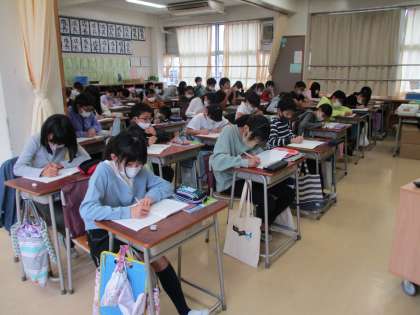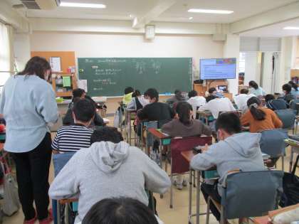 「これからの食料生産とわたしたち」の単元の学習で、食料自給率のグラフを見て疑問や思ったことをノートにまとめています。日頃食卓で食べている様々な食べ物の多くは輸入に頼っていることや、他国との良好な関係を継続することが、今の日本の食料事情には欠かせないことに気付いている子がいます。