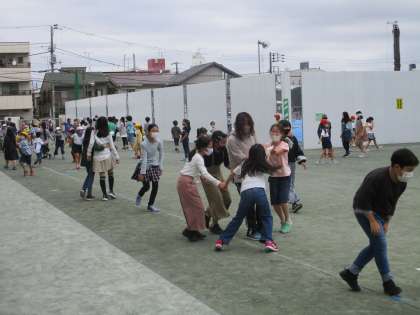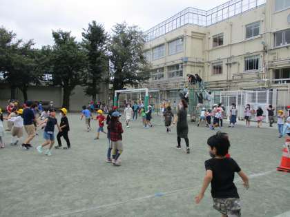 あちこちで先生と一緒に遊んでいる子どもたちがいます。