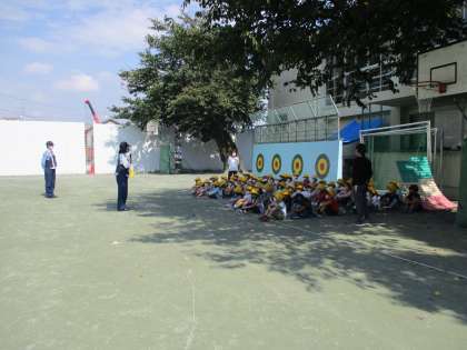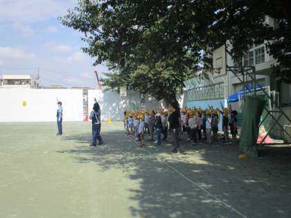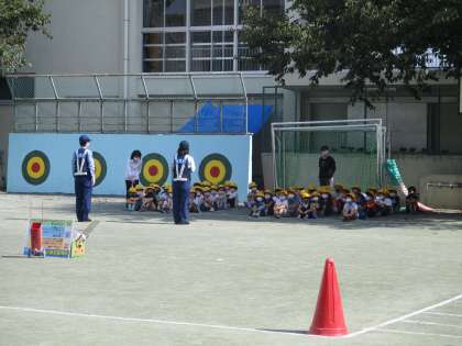 今日は延期になっていた交通安全教室を1年生と3年生で実施しています。1年生は校庭で道路の歩き方をおまわりさんから教わっています。よい姿勢で話を聞いた後、横断歩道を渡る時の左右の安全確認の仕方を、みんなで一緒に行っています。