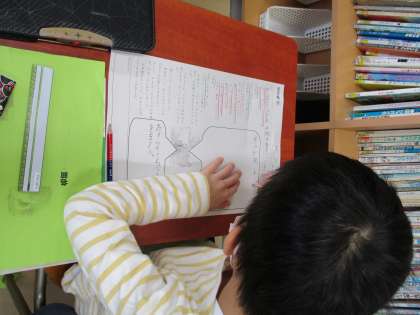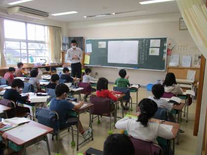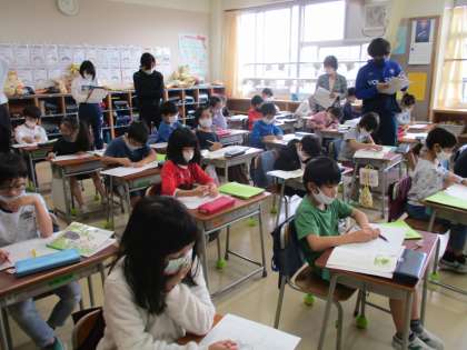 アーノルド・ローベルの「お手紙」の読み取りをしています。研究授業のため、校内のいろいろな先生が入れ代わりで授業を参観に来ています。いつもとは違った雰囲気がありますが、集中して学習に取り組んでいます。