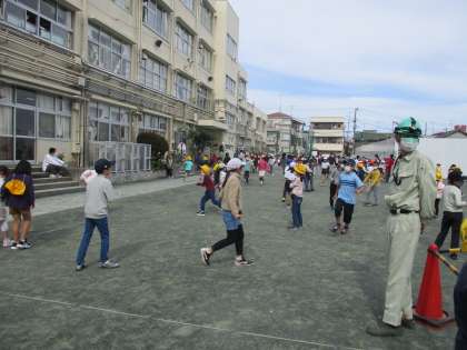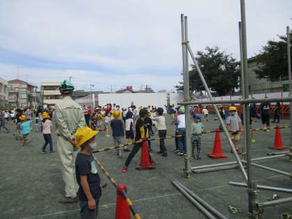 柵を設置しているそばには、警備の方に立っていただいています。だんだんと柵を付けるための枠組みが出来上がっていく中、休み時間を過ごしています。