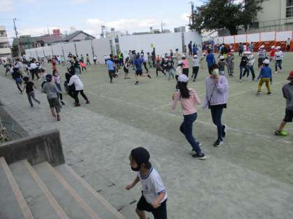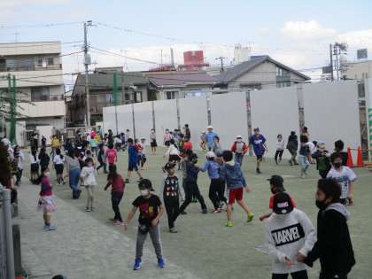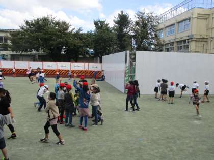 正門の近くの辺りまで遊びのスペースにして遊ぶ様子が見られます。より安全に遊べるように遊び方のルールを決めていきます。