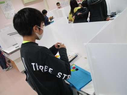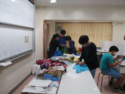袋作りに取り組んでいます。無地の布に自分で考えたデザイン通りになるよう、フェルトをアイロンの熱で付けていきます。アイロンがけの前に、フェルトを並べてみて、位置を決めています。