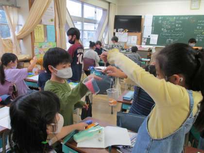 ブロックの数がいくつになったか、各グループの結果を最後に比較しました。直接比較した時よりは、ブロックいくつ分違うと分かるものもありましたが、やはりはっきりとした違いを表すことはできませんでした。次の時間の学習でさらに考えていきます。