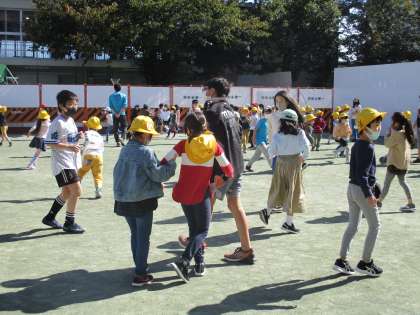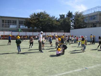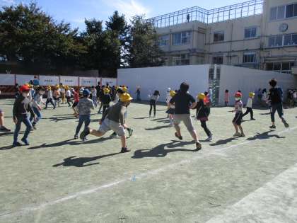 校庭がさらに狭くなったため、学年ごとに場所を区切って遊んでいます。1年生、2年生、6年生が遊ぶ場所では、1年生と6年生が一緒になっての鬼ごっこが始まりました。大きな6年生を1年生がつかまえて嬉しそうです。