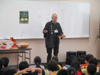 まずは講師の先生のお話を伺いました。かんぴょう生産が全国シェア95%であることを知り、「すごい」との声が上がっていました。その後、本物のかんぴょうやふくべ細工の完成見本を見せていただきました。