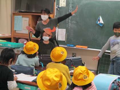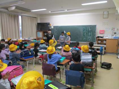 お家の方々にお手伝いいただいて作った、学芸会で使う被り物について、先生から扱い方についての注意を聞きました。被り物は自分専用として使うことが感染予防になるとのお話がありました。