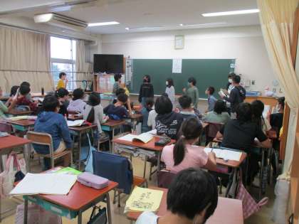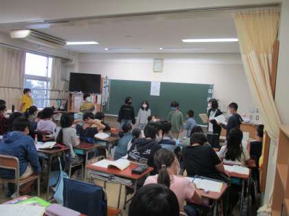 教室で学芸会の劇の一部の練習をしています。自分の台詞を言う時だけでなく、台詞を言わない時もその役柄としての演技が求められます。「突っ立ってないで動こう」との先生の言葉に、思い思いの動きを考え、表現してみて、友達から意見をもらっています。自然な動きに見えるようになるには、その役になりきって、役の気持ちで動くことが必要ですが、大人でも難しいものです。